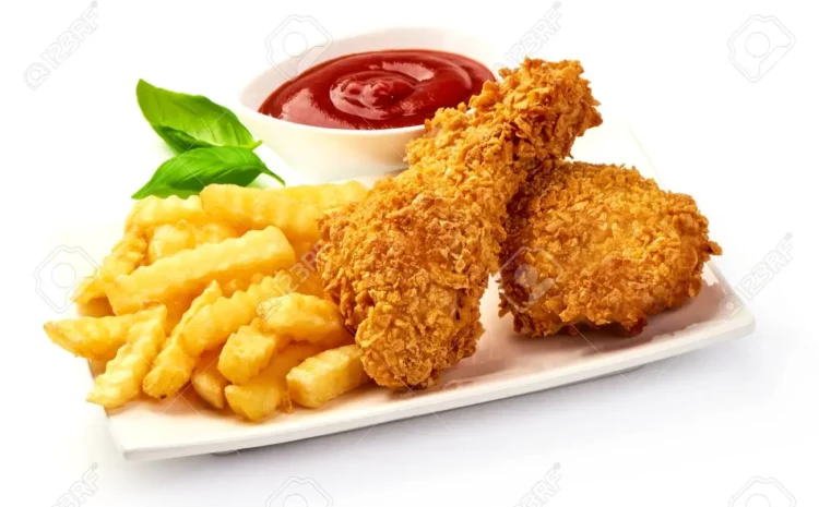 105929292-breaded-crispy-fried-chicken-legs-with-french-fries-and-tomato-sauc...