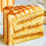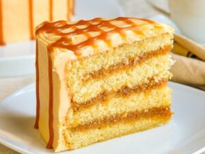 The-Best-Caramel-Cake-slice-of-cake-on-a-white-plate-with-coffee-in-backgroun...
